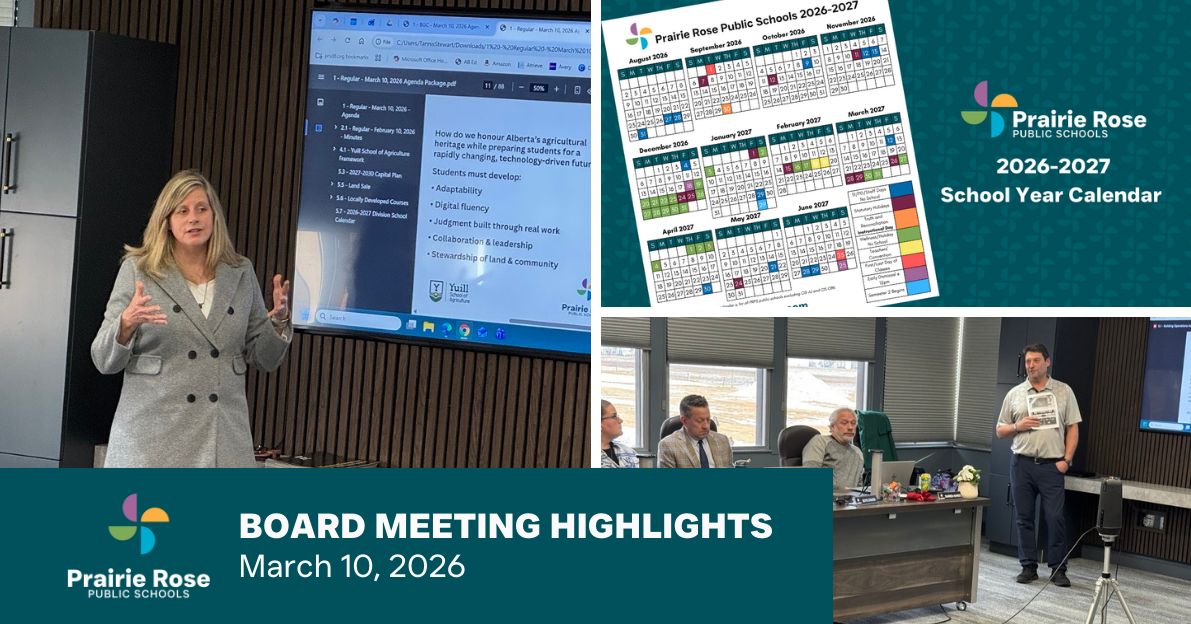 The Superintendent and Executive Team provided updates on current divisional initiatives and activities across Prairie Rose Public Schools, including Prairie Rose’s support of the Special Olympics Canada Summer Games, with the Transportation department providing bus services for athletes and participants attending the event in Medicine Hat in August 2026.